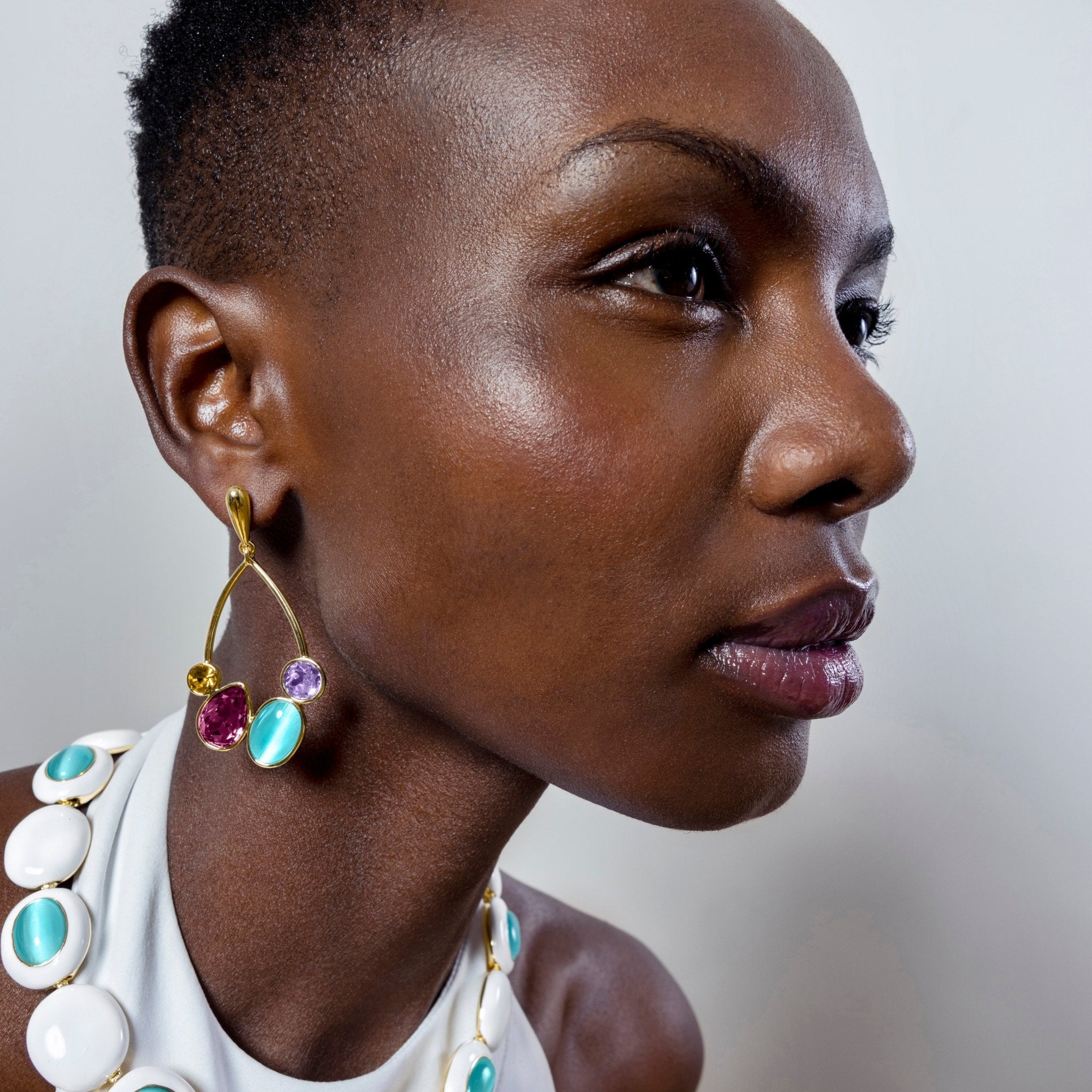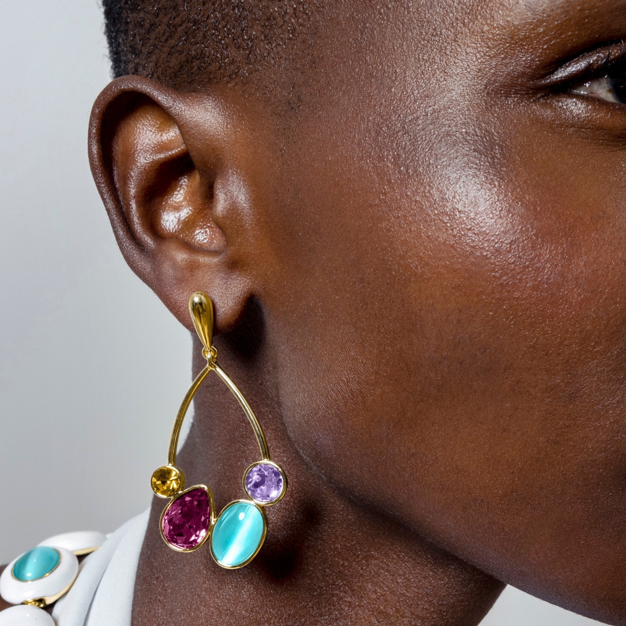 Mortha earrings with multicolored zirconia, finished in 18k yellow gold. Africa is the perfect line for women with personality, who aren't afraid to take risks and wear pieces with their own character.